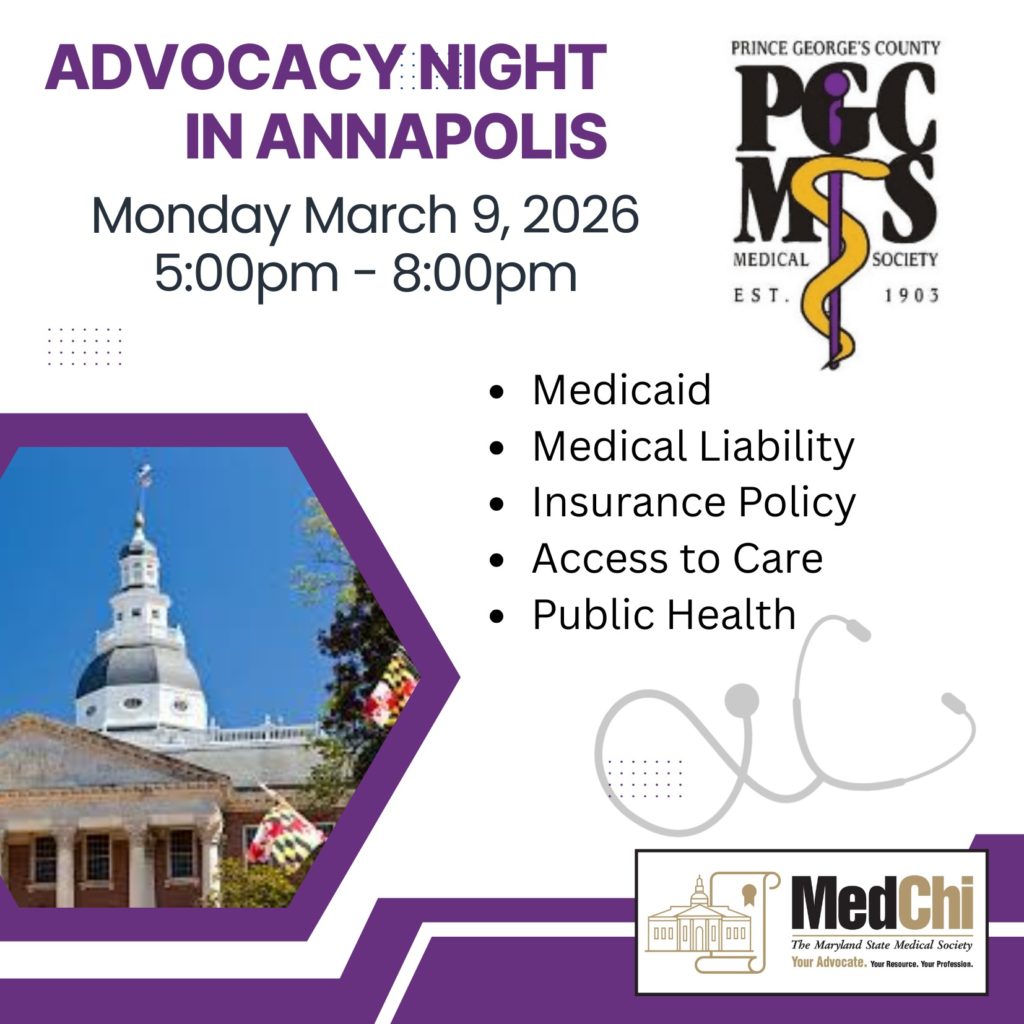 Join us in Annapolis for PGCMS’s Annual Legislative Advocacy Night. Meet directly with lawmakers to discuss legislation impacting Prince George’s County physicians and patients.